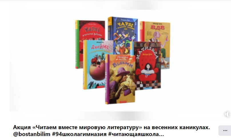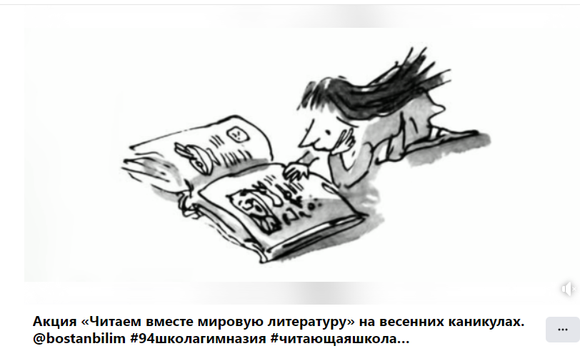 30 наурыз 2023 0 1 2 3 4 5 Көктемгі демалыста "әлемдік әдебиетті Бірге оқимыз" акциясы. Көктемгі демалыста "әлемдік әдебиетті Бірге оқимыз" акциясы. @bostanbilim#94школагимназия#читающаяшкола#читаемвместемировуюлитературуhttps://www.facebook.com/94Almaty/videos/771905894105013/?extid=WA-UNK-UNK-UNK-AN_GK0T-GK1C&mibextid=1YhcI9R&ref=sharing