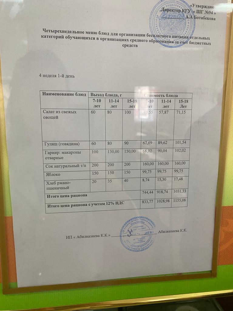 Мәзір/Меню 4 жұма/неделя 1 күн/день