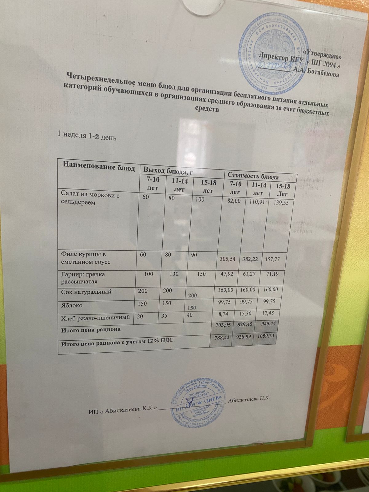 Мәзір/Меню 1 жұма/неделя 1 күн/день