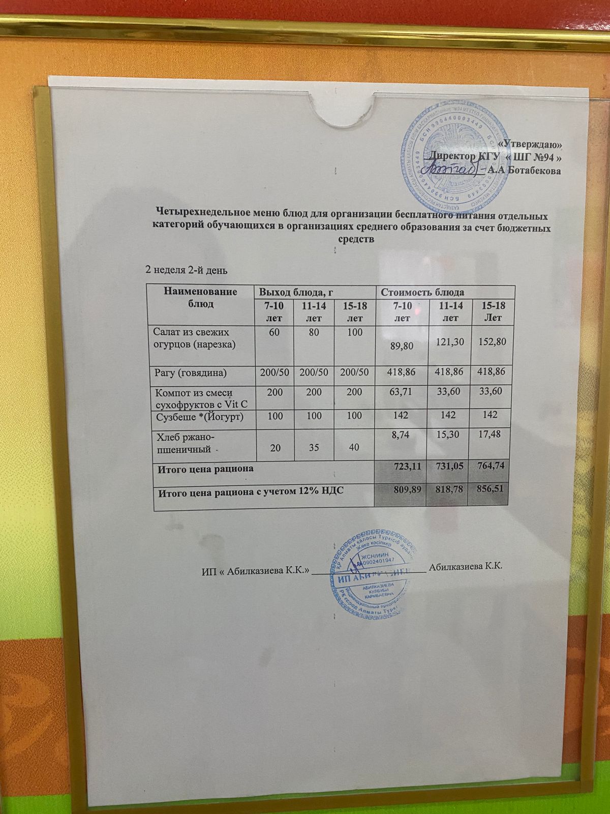 Мәзір/Меню 2 жұма/неделя 2 күн/день