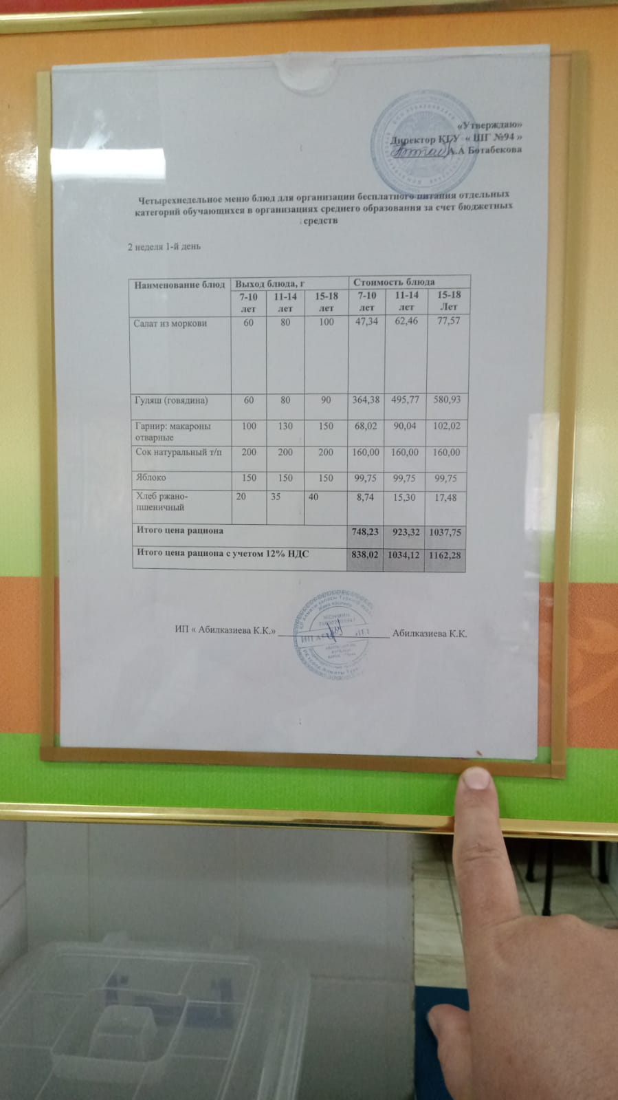 Мәзір/Меню 2 жұма/неделя 1 күн/день