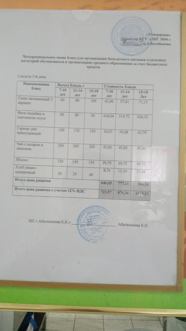 Мәзір/Меню 3 жұма/неделя 3 күн/день