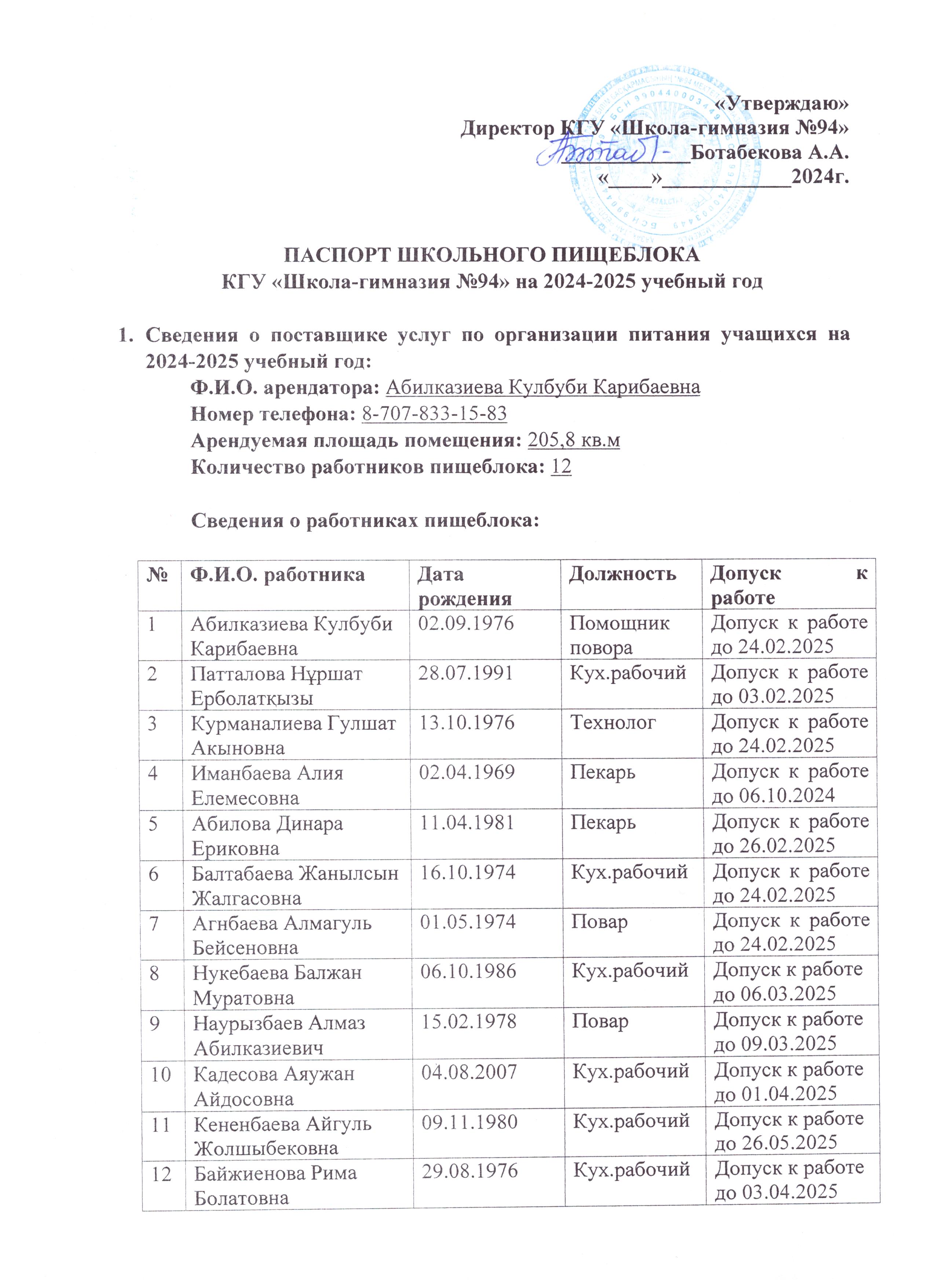 Ас блогының паспорты / Паспорт школьного пищеблока