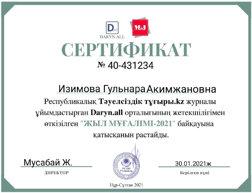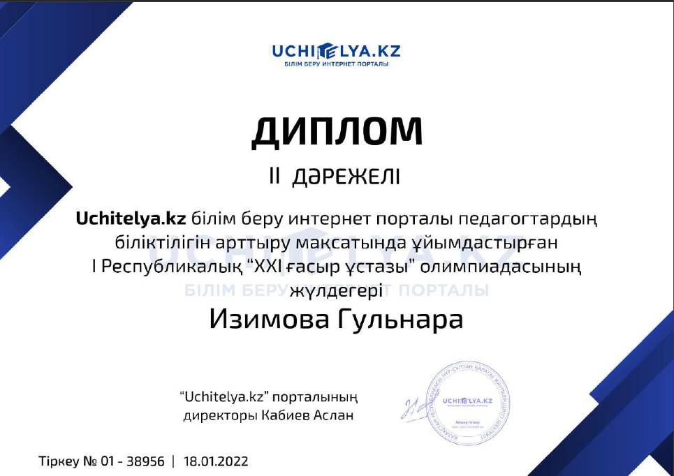 02 маусым 2022 0 1 2 3 4 5 Изимова Гульнара Акимжановна, учитель информатики. Теги: Изимова Гульнара Акимжановна учитель информатики.